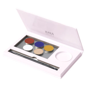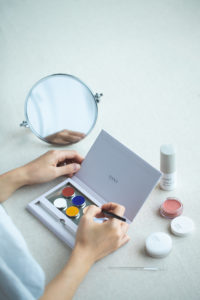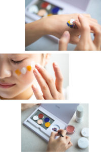 赤(紅殻)、青(群青)、黄(黄土)の3原色と、濃度やツヤ感をコントロールする白(白土)とシアーアップ。それぞれ抗炎症作用のある植物エキスや白檀パウダー、花精油を練りこんだ天然バームをベースとしています。天然由来率100%であるため肌にやさしく、せっけんで簡単に落とすことができ、アイカラー、チーク、口紅、ハイライト、コンシーラーなど、使い方も選ばない自由自在なメイクパレットです。紙製のメイク道具箱はリフィルの色皿を入れ替えながら長くお使いください。