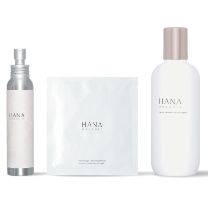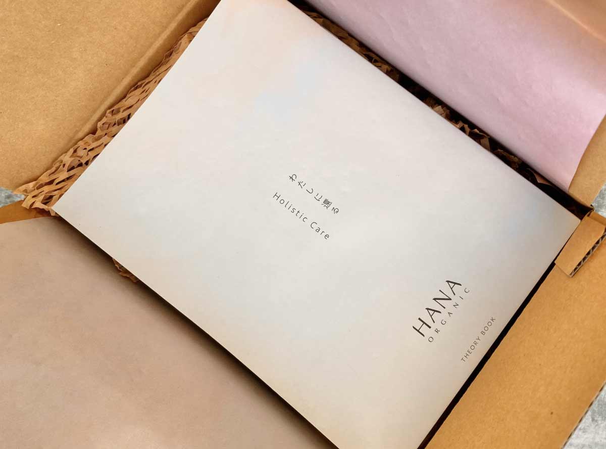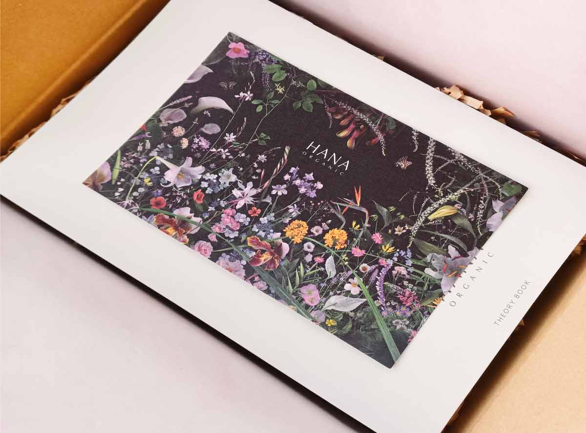 製品の上には、セオリーブック(価格の記載なし)と、ブランドカードが入 っており、初めてHANA ORGANIC に出会っていただくお客様に少しでも 世界観を感じていただける仕様になっています。