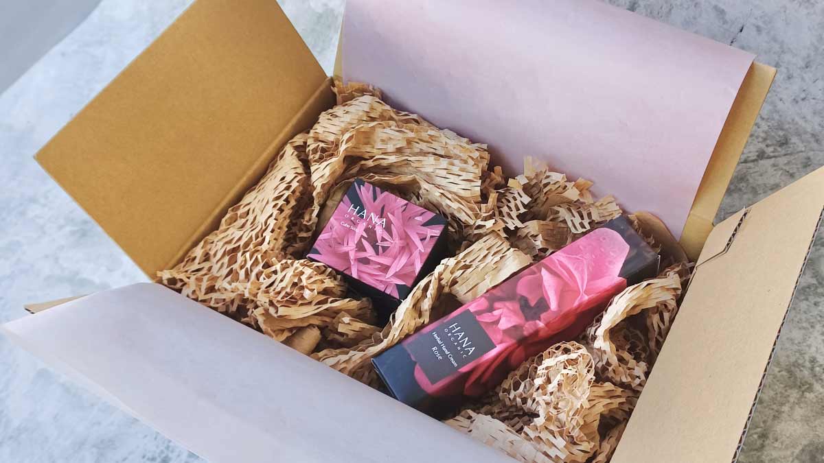 配送中の振動で製品に傷がつかないようペーパークッションで固定し、 HANA ORGANICオリジナル包装紙でお包みしてお届けします。