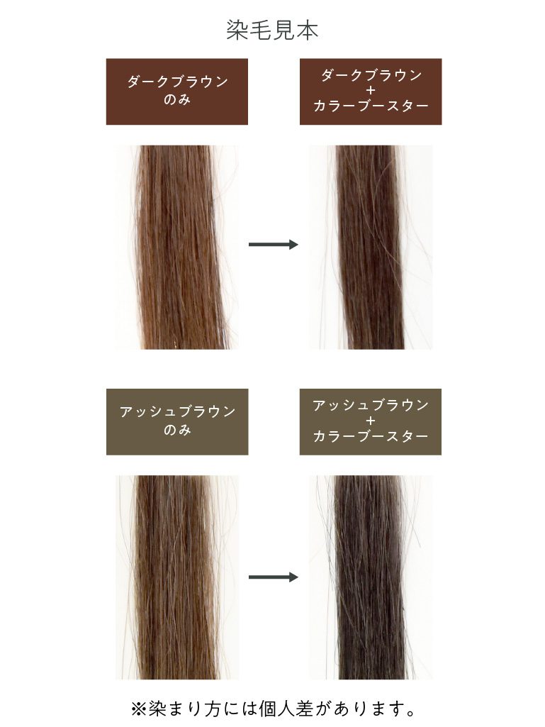 また青味が強く出るため、黒髪の方はアッシュブラウンにカラーブースターを混ぜて使っていただくと、単独で使うよりも黒に近い色になりさらになじみやすくなります。