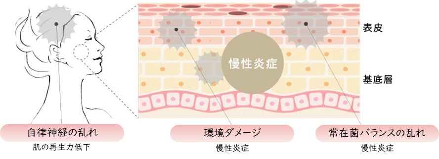 原因はたったひとつ「年齢以上の肌の再生力の低下」です。 肌は本来、自らの力で自己再生(ターンオーバー)を繰り返し、常に新しく生まれ変わっています。自己再生が正常に行われないから、古い角質が残り、皮脂が詰まり、色素も沈着・・・肌の不調スパイラルに陥るのです。現代環境は、その阻害原因が多様にあり、多くの方が肌の奥につねに「慢性炎症」を起こしています。いち早くこの「慢性炎症」に気づくこと、そして”シミ、くすみには美容液、しわにはクリーム、ニキビには・・・”というような対処的なケアを止め、自身の「肌の再生力」を上げることが、いつまでも美しい自分自身の肌を守る切り札なのです。